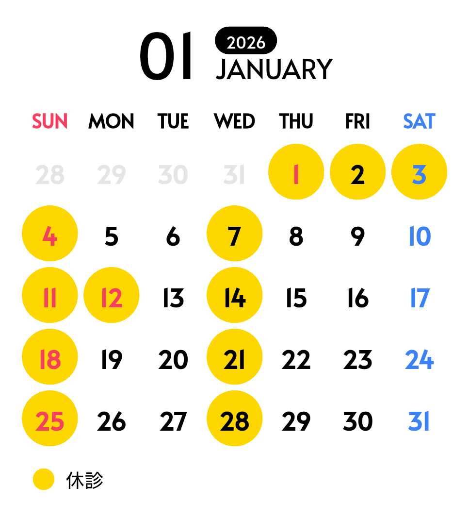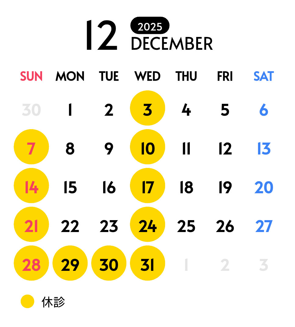 いつもご利用ありがとうございます。誠に勝手ながら、下記の通り休診させていただきます。